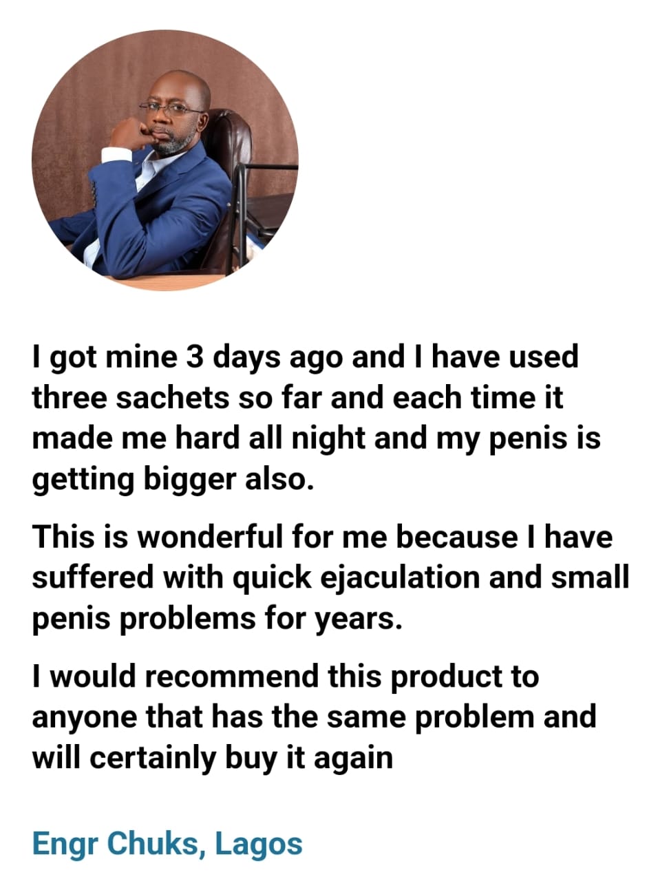 if you were a lady, will you like such man? Now let me tell you what this product will do for you, there are cells in your body that are responsible for your cum and they want to come out immediately you start having sex but what this product will do is that it will delay the work of that cell for as long as you want.
